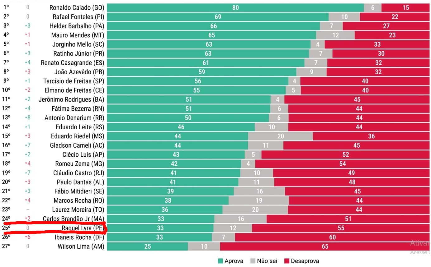 Pesquisa do instituto AtlasIntel divulgada nesta quarta-feira (17/12) aponta que a governadora Raquel Lyra (PSD) obteve a 3ª pior colocação entre os 27 chefes de Executivo estaduais do país. No